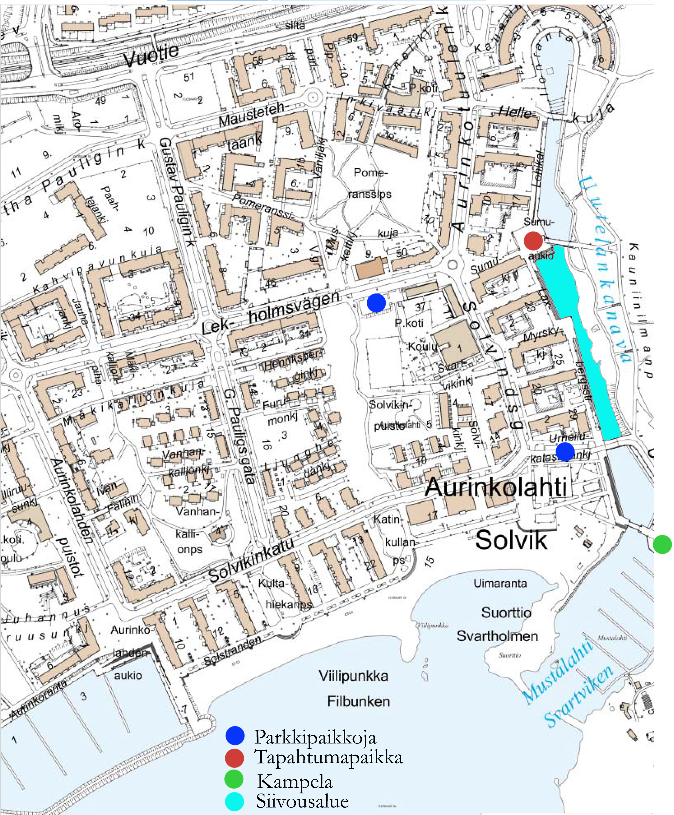 Alla kartta, josta löytyvä tapahtumapaikka sekä muut tapahtumaan liittyvät paikat.